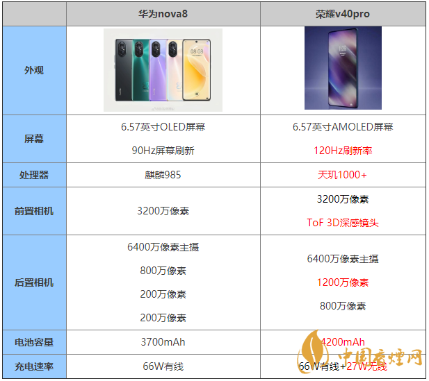 华为nova8和荣耀v40pro:在同样都支持了66W的快充基础上,荣耀v40pro的4500mAh电池容量更大,并且支持27W的无限快充,就算整日的使用也无需担忧充电时间。