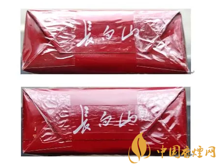 真品卷烟:1.拉线头形状为饱满的半椭圆形。2.透明纸上烙铁痕迹宽且明显。3.商标纸超线印刷长白山图案和logo图案,侧光观察明亮、清晰。(上真下假)
