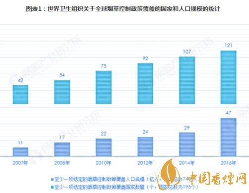 世界卫生组织(World Health Organization,简称WHO)发布的主题为监测烟草使用与预防政策《2017年全球烟草流行报告》显示,当前全球控烟政策的覆盖面继续扩大,全球共有121个国家共47亿人口(全球近三分之二的人口)受到控烟政策的影响,目前仍有74个国家共27亿人未受到控烟政策的覆盖。此外,虽然部分国家和地区的卷烟消费量有所下滑,全球卷烟消费的增速放缓,但全球吸烟人口数量仍在不断增加。