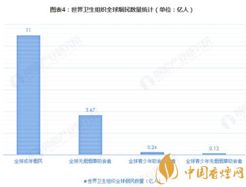 世界卫生组织的报告指出,2000年以来全球男性和女性的吸烟率均有所降低,但吸烟人数仍在增长。具体来看,全球15岁以上的男性吸烟率从2000年的43%下滑到34%,而女性吸烟率则从2000年的11%下滑到6%。从吸烟人数的规模来看,目前全球共有11亿成年烟民以及至少3.67亿无烟烟草吸食者。此外,全球还有大约2400多万名13岁-15岁的青少年吸食烟草,另有1300多万名青少年使用无烟烟草制品。