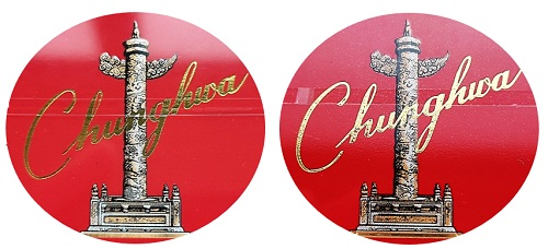 真品卷烟:华表柱中祥云、龙图案印刷清晰、色泽均匀一致;侧光观察华表柱图案印刷整体油润饱满、凸起;中华字母烫金完美。