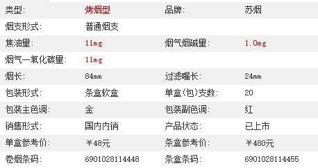 | 类型 :烤烟型 | 焦油量 :11mg | 烟气烟碱量 :1mg | 一氧化碳量 :11mg |