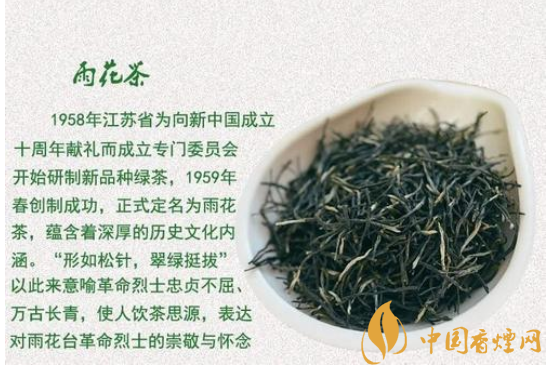 后来,雨花台一带开始遍布葱郁碧绿的茶园。雨花茶的色、香、味、形俱佳,她外形圆绿、条索紧直、峰苗挺秀,带有白毫,犹如松针,象征着革命先烈坚贞不屈、万古长青的英雄形象。