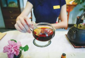 闻香:因为大红袍的香高,在冲泡过程中,都会有满室生香的效果。将品茗杯及闻香杯一齐放置在客人面前。 把闻香杯中的茶倒入品茗杯中,双手搓动闻香杯。微微摆闭上眼睛,深呼吸。。(品茗杯在右,闻香杯在右)