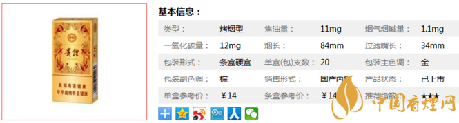 | 类型 :烤烟型 | 焦油量 :11mg | 烟气烟碱量 :1.1mg | 一氧化碳量 :12mg |