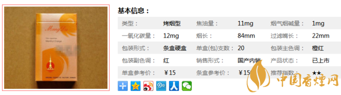 | 类型 :烤烟型 | 焦油量 :11mg | 烟气烟碱量 :1mg | 一氧化碳量 :12mg |