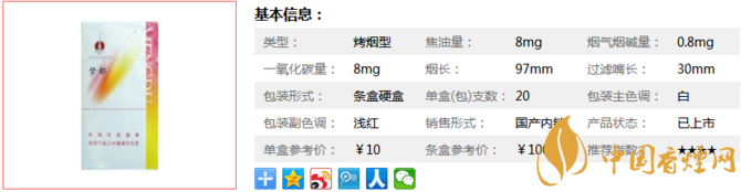 | 类型 :烤烟型 | 焦油量 :8mg | 烟气烟碱量 :0.8mg | 一氧化碳量 :8mg |