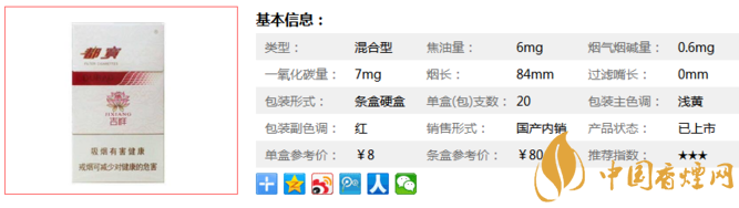 | 类型 :混合型 | 焦油量 :6mg | 烟气烟碱量 :0.6mg | 一氧化碳量 :7mg |