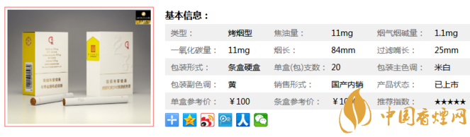 | 类型 :烤烟型 | 焦油量 :11mg | 烟气烟碱量 :1.1mg | 一氧化碳量 :11mg |