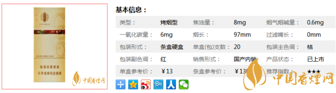 类型 :烤烟型 焦油量 :8mg 烟气烟碱量 :0.6mg 一氧化碳量 :6mg