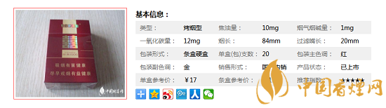 | 类型 :烤烟型 | 焦油量 :10mg | 烟气烟碱量 :1mg | 一氧化碳量 :12mg |