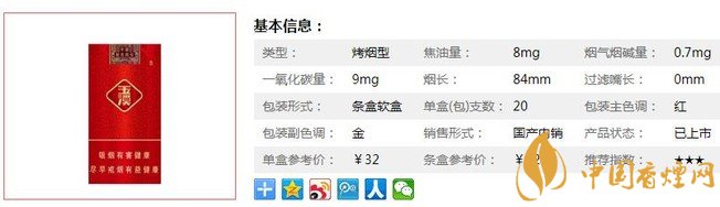 | 类型 :烤烟型 | 焦油量 :8mg | 烟气烟碱量 :0.7mg | 一氧化碳量 :9mg |