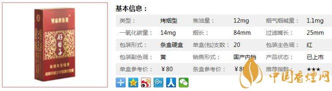 | 类型 :烤烟型 | 焦油量 :12mg | 烟气烟碱量 :1.1mg | 一氧化碳量 :14mg |