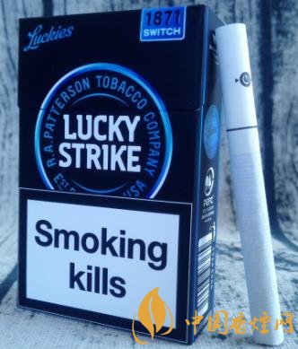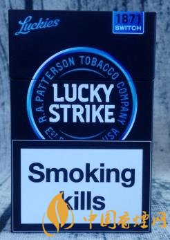 蓝色,本就属于神秘的色调。二者结合起来,带来的视觉感,无疑更加强烈。抚摸烟盒的六面体,观赏着黑蓝相融的色调,不失为一种雅趣。圆圈中的LUCKY STRIKE,抚摸起来凹凸感很明显。翻盖处1871下方的SWITCH,意为“转变、转换”,也就是指因为过滤嘴内置爆珠,从而改变烟的味道。这款欧盟版的烟盒正面上方,没有印制CLICK(捏破)字样及爆珠标识,烟盒底部和内衬锡纸上则有印制。