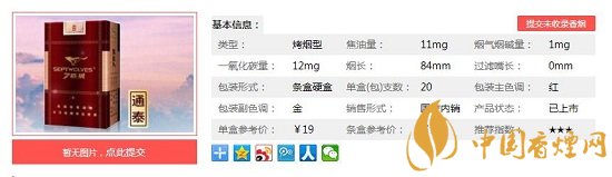 | 类型 :烤烟型 | 焦油量 :11mg | 烟气烟碱量 :1.1mg | 一氧化碳量 :12mg |