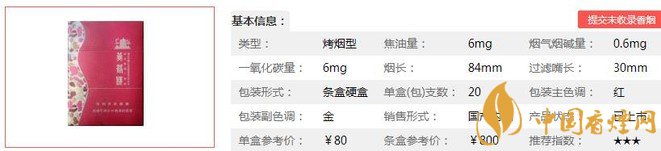 | 类型 :烤烟型 | 焦油量 :6mg | 烟气烟碱量 :0.6mg | 一氧化碳量 :6mg |