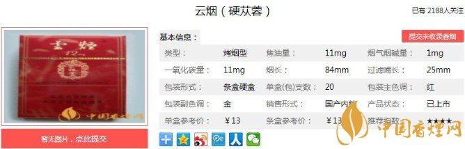 云烟(硬苁蓉)采用特制嘴棒、高透气度盘纸及激光打孔水松纸等新型卷烟材料,产品具有较高技术含量。硬苁蓉直到掀开翻盖深嗅,才能闻到那股特殊的香味。下面便是云烟(硬苁蓉)的基本参数:焦油量:11mg 烟碱量:1.0mg 一氧化碳量:11mg.
