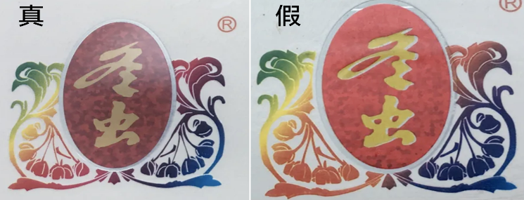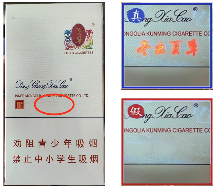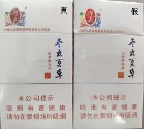 真烟的“冬虫”标志颜色深,呈凸面效果,有立体感;假烟标志颜色过于鲜艳,图案没有立体感且有漏印现象。