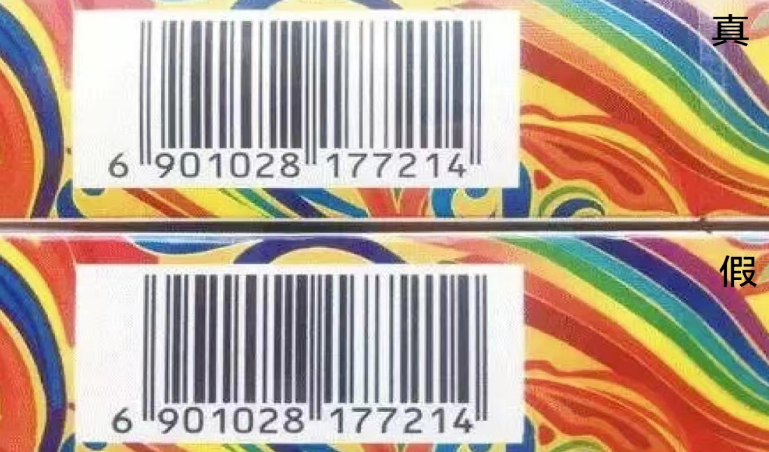 真烟侧面条形码上字体较细;假烟侧面条形码上字体较粗。