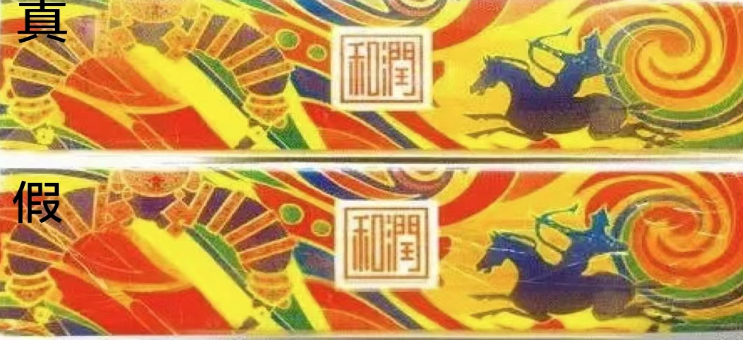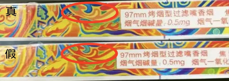 真烟圈内图案中间为蓝色,假烟则变成了绿色;真烟的线条为黄色,假烟变成了红色。