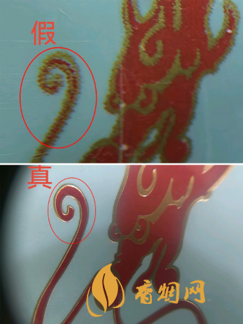 条盒正面图案:真烟的龙形图案龙须不漏金,表面光滑金亮;而假烟的龙形图案龙须有漏金现象,表面粗糙。