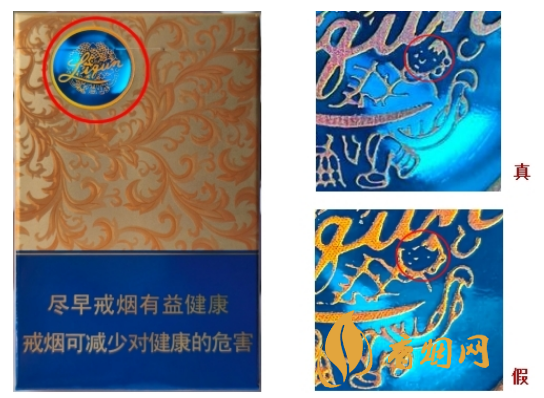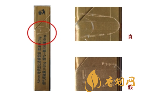 假烟烫金部分色泽暗淡,图案烫金部分有漏金或毛边,“小女孩”面部刘海和五官部分与真烟有明显差异。