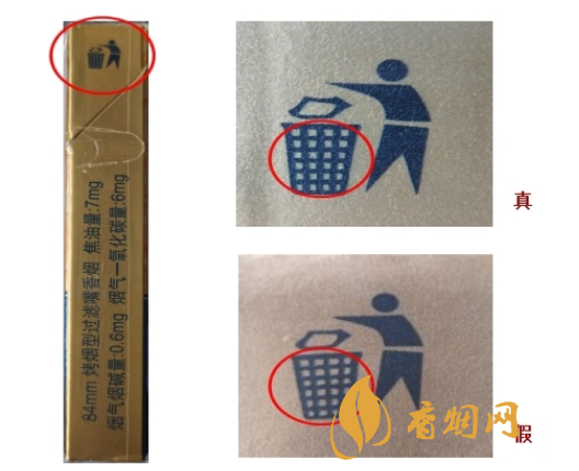 假烟色彩暗淡,垃圾桶的小框由上而下逐渐变型,与真烟有明显差异。