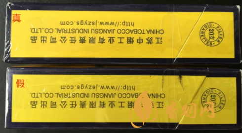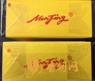 条盒:真品条盒正面底色花纹具有立体感,双龙图案凹凸感明显,“南京”字样及麒麟图案套色均匀。假烟底色无光泽,印刷粗糙,双龙图案模糊不清。