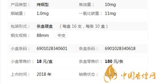 | 类型 :烤烟型 | 焦油量 :10mg | 烟气烟碱量 :1mg | 一氧化碳量 :11mg |