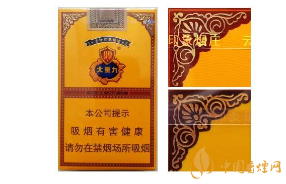 细支大九采用硬盒包装,外观印刷设计没有什么改变,无杂质的金矿黄衬托盾牌花边“大重九”,背面是麦穗包裹99,简单大气的包装却不失豪华端庄,那么这款大重九多少钱一包,它的价格为100元/包。
