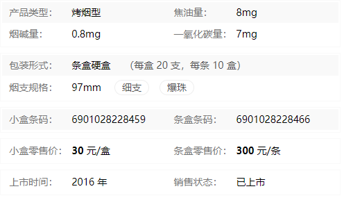 | 类型 :烤烟型 | 焦油量 :8mg | 烟气烟碱量 :0.8mg | 一氧化碳量 :7mg |