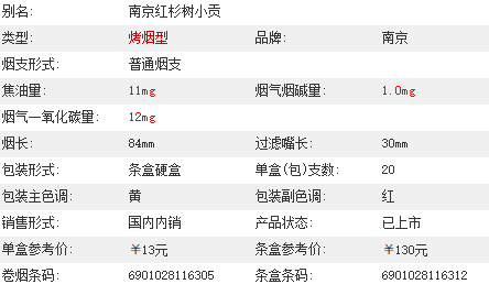 | 类型 :烤烟型 | 焦油量 :11mg | 烟气烟碱量 :1mg | 一氧化碳量 :12mg |