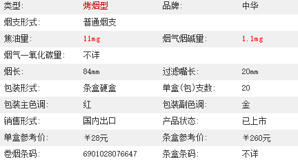 | 类型 :烤烟型 | 焦油量 :11mg | 烟气烟碱量 :1.1mg | 一氧化碳量 :12mg |