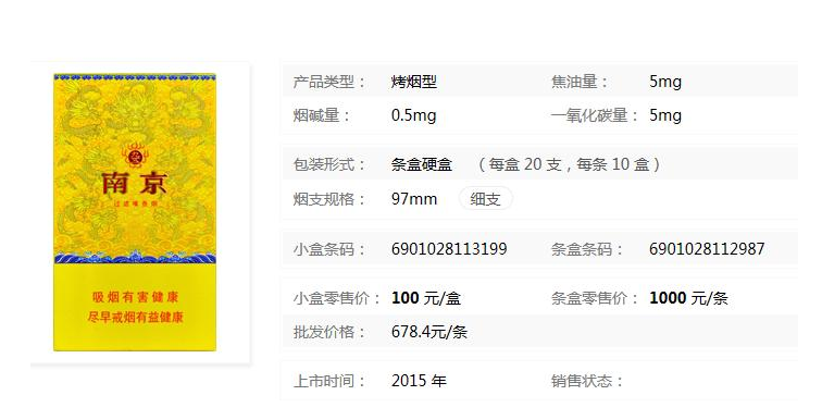 单盒参考价:100;条盒参考价:1000;批发价格:678.4元/条