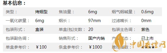 | 类型 :烤烟型 | 焦油量 :11mg | 烟气烟碱量 :1.1mg | 一氧化碳量 :13mg |