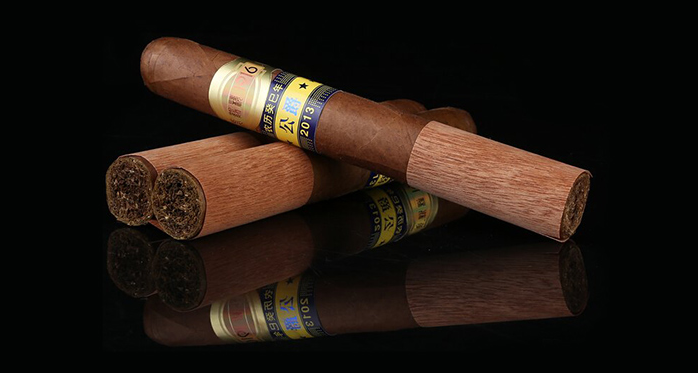 工艺:原料甄选于中南美洲多米尼加茄衣烟叶、亚洲印尼和种植于海南的古巴烟种作为茄心茄套烟叶;采用天然溶洞窖藏,在大自然恒温恒湿的环境中(常年20℃, 湿度70%)缓慢柔和地进行二次发酵,去除茄衣烟叶的青杂气,提升柔和度与饱满度,独具高级手工雪茄特有的茄香。