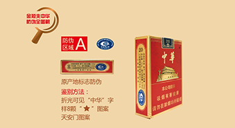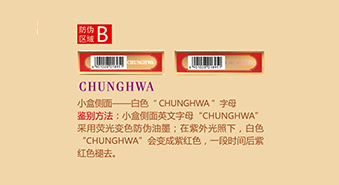 “中华”(金短支)产品小盒侧面英文字母“CHUNGHWA”采用荧光变色防伪油墨;在紫外光照下,白色“CHUNGHWA”会变成紫红色,一段时间后紫红色褪去。