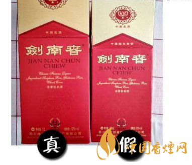 二、重点从商标标签上鉴别1、 真品剑南春酒标签主要特征:(1)正标标签上“剑南春”三个字,“注册商标标识、外花边”、“jian nan chun chiew”剑南春酒拼音均有凸凹感,印刷套印比较准确,线条清晰,字体边缘不毛,轮廓清楚。(2)小字体:酒精度、净含量、厂名、厂址和简介,这些字体很清晰、均匀、无断裂,边缘颜色协调。(3)背标标签:背标标签鉴别主要从简介内容及印刷字体入手,字体清楚、不毛边,边缘颜色协调。2、 假冒剑南春酒标签的特点(1) 正标标签上凸凹感不明显;(2)字体套印不准确,线条不均匀,字体有毛边和粗细不匀等现象;(3)小字体不清晰和模糊现象严重;(4)背标标签边缘颜色与背标整体不协调。