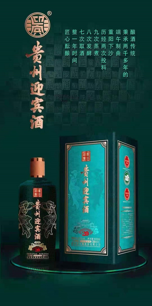 贵州迎宾酒20,贵州迎宾酒股份有限公司新推出的一款53度酱香型白酒。以本地优质糯高粱和小麦为原料,秉承两千多年的传统工艺,重阳下沙,经过九次旋转蒸笼方向,九次蒸煮,蒸馏,八次糖化,发酵,七次取酒而得原酒,原酒再经“酒槽窖酒法”“桑拿老熟法”醇化“植物埋藏法”陈酿而成之。使其色清透明,酱香突出,醇香馥郁,幽雅细腻,入口柔绵,清冽甘爽,酒体醇厚丰满,回味悠长的特点。