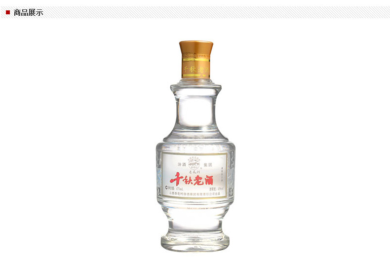 千秋老酒属清香型白酒,采用传统汾酒酿造工艺,融千年古法秘方和现代科技微生物发酵技术为一体,在精心研制出的独特配方和汾酒酿造工艺的基础上,经发酵、蒸馏、贮存、老熟精酿而成,原汁、原色、原味。其特点是酒色清澈透明,酒体粘而不稠,醇香柔绵、回味怡畅,有入口绵、落口甜、饮后余香、回味悠长,不辛、不辣、不冲的优点,给人以朴实纯正、爽冽纯醇之美感,具有汾酒独特的清香风格。