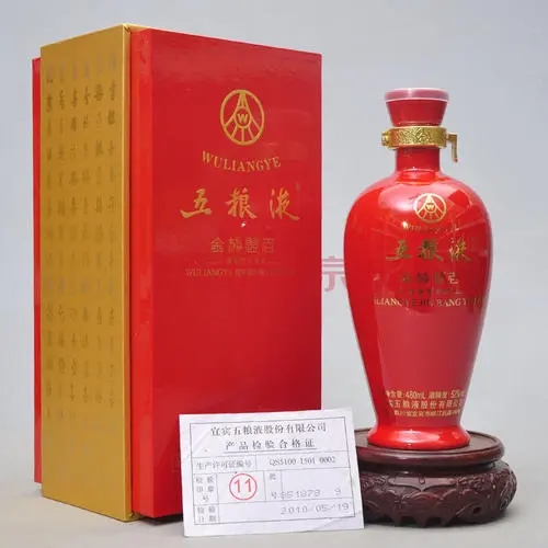 真品注册的五粮液商标是“五粮液”牌,以醒目的“五粮液”三个大字作为特殊标志,商标图案底部用黄色谷穗衬映,谷穗以上全部套红,“五粮液”三个字是谷穗图形略凸起,商标背面印有出厂日期,透过酒液和瓶体就能看清楚。五粮液仿制品的装潢设计都几乎可以以假乱真,但假酒多数都是商标印刷粗糙,或者根本就没有注册商标。
