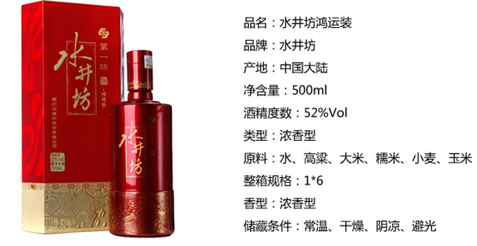 以上是小编整理的有关水井坊鸿运装52度价格和水井坊52度鸿运装多少一瓶的相关资料信息,希望能够对大家了解相关情况有所帮助,想获得更多消息资讯请关注jrs直播!
