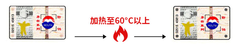 按照茅台防伪标签示意图的第一点标识是“不可逆温变点”,仔细看示意图的四个角都有一个浅浅的圆点,这四个圆点在加热至60℃以上后图案就会呈黑色,变的非常明显,并且不能恢复。如下图: