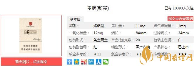 贵烟新贵产品类型:烤烟型、焦油量:11mg、烟碱量:1.0mg、一氧化碳量:12mg、包装形式:条盒硬盒(每盒 20 支,每条 10 盒)、烟支规格:84mm。