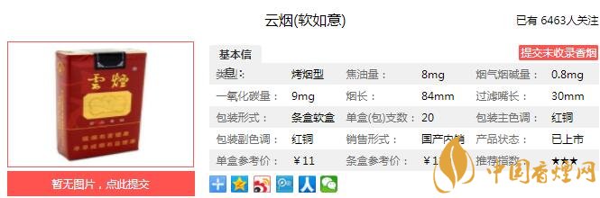 云烟软如意产品类型:烤烟型、焦油量:8mg、烟碱量:0.8mg、一氧化碳量:9mg、包装形式:条盒软盒(每盒 20 支,每条 10 盒)、烟支规格:84mm。