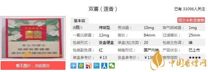 双喜莲香烟烟支长84mm,过滤嘴长34mm,烟支呈767排列,烟支设计简单清新,浅黄色的烟嘴配上双喜logo,一朵莲花衬托在双喜的logo旁。烟丝色泽深黄,无烟梗,烟叶发酵程度、膨胀程度合适。下面我们一起来看双喜莲香的参数信息:焦油量:10mg 烟碱量:1.0mg 一氧化碳量:12mg