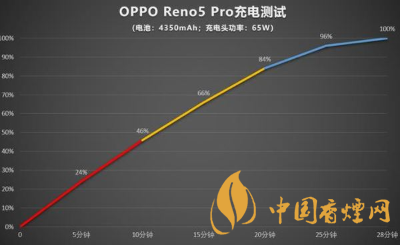 除了超长续航之外,OPPO Reno5 Pro还加入了65W超级闪充技术,进一步提升快充体验。从实际测试结果来看,如果从零开始进行充电,OPPO Reno5 Pro只要5分钟就能充电24%,10分钟就能充电46%,充到100%只需要28分钟,充电速度非常快。即便是手机没电了,OPPO Reno5 Pro也能快速回血,一会功夫就能完成充电工作,日常使用更方便。
