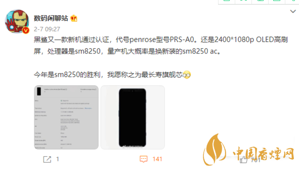 “黑鲨又一款新机通过认证,代号penrose型号PRS-A0。还是2400*1080p OLED高刷屏,处理器是sm8250,量产机大概率是换新装的sm8250 ac。”