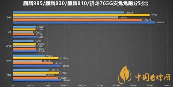 同时从麒麟985/麒麟820/麒麟810/骁龙765G安兔兔成绩横向对比图来看