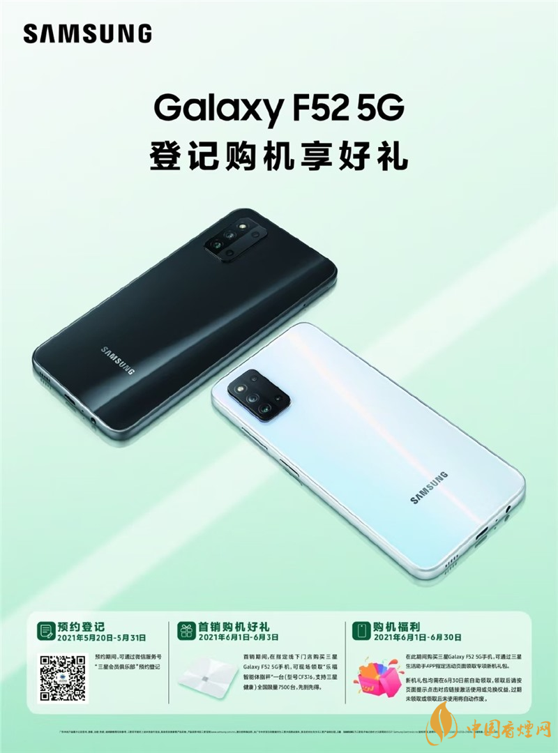 三星 Galaxy F52 5G 将于 5 月 20 日开启国行预约,6 月 1 日正式开售,海报与真机图已曝光。